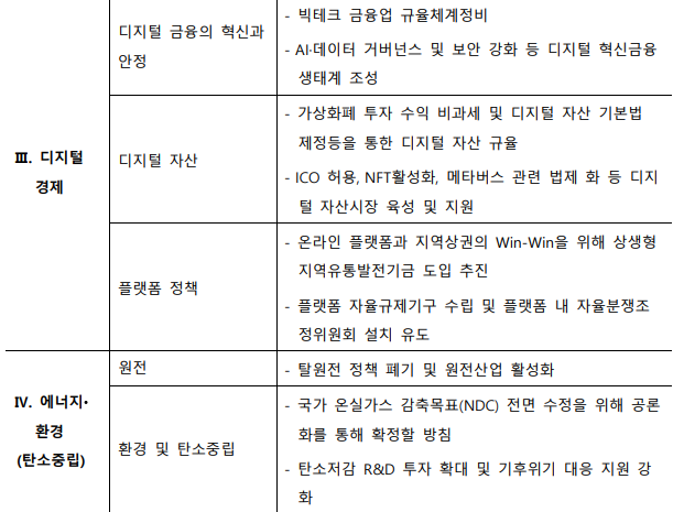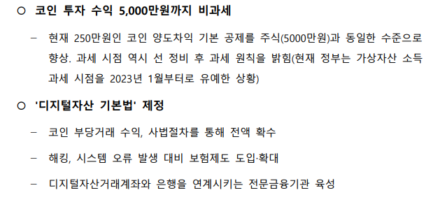 윤석열 당선인의 공약 중 하나. 코인 투자수익을 5,000만 원까지 비과세 하겠다는 발언도 있었습니다. 국내 코인 발행 허용, NFT 활성화, 소프트웨어 산업 육성 및 메타버스 선도국가를 이끄는 모습을 법제화를 통해 추진하겠다는 의지를 보여준 바도 있습니다. 투자자 중심 정책으로 그 동안의 부정적인 인식에서 벗어나서 산업 진흥을 목적으로 가상자산에 친화적인 현실성 있는 개선책을 제시한 셈입니다.