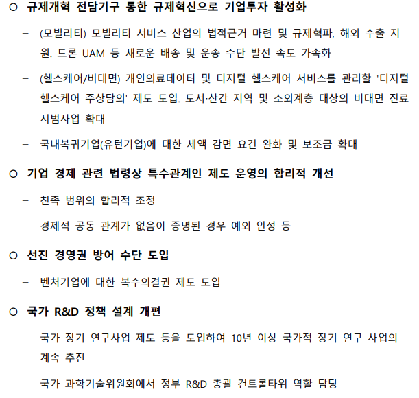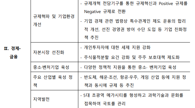기본적으로 국가에서 법률로 정해놓은 형식의 사업 이외는 하지 못하도록 현 정부에서 막았더라면 국민의 안전과 관계되는 게 아니라면 철저하게 네거티브 규제로 제도를 바꾸겠다 말한 바 있습니다. 지역별로 산업규제를 철폐해 특성화가 가능하도록 법을 개정하고, 비대면 의료 혜택을 국민 모두가 누릴 수 있도록 하겠다고 말했습니다.