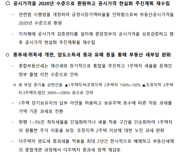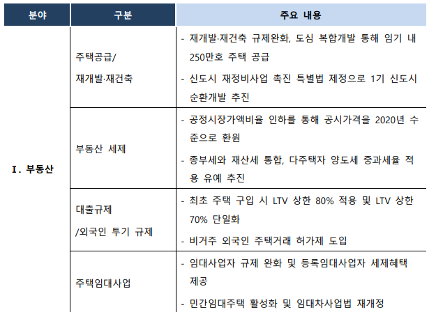 재건축, 재개발 규제완화, 도심 역세권 복합개발을 통해 5년간 250만 호 이상 공급. 주택법과 별도로 30년 이상 노후 공동주택에 대해 리모델링 추진법을 제정하고 리모델링 수직 수평 증축 기준을 정비한다고 합니다. 뿐만 아니라 기반시설 설치, 용적률 인센티브 등을 통한 소규모 주택 공급을 제공한다고 합니다.