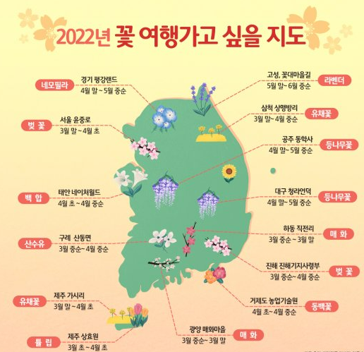 한국인들은 봄을 떠올릴 때 가장먼저 활짝 피어나는 꽃을 먼저 떠올린다고 합니다. 새로운시작, 여행 등이 그 뒤를 이었는데 이번 봄에 여행을 갈 계획이 있다고 대답한 사람들이 정말 많았습니다. 벚꽃개화하면 꽃구경을 가는데 가까운 곳 봄나들이 만으로도 만개한 꽃 사이에 있으면서 정서적으로 힐링이 되고, 기분이 좋아지기 때문입니다.