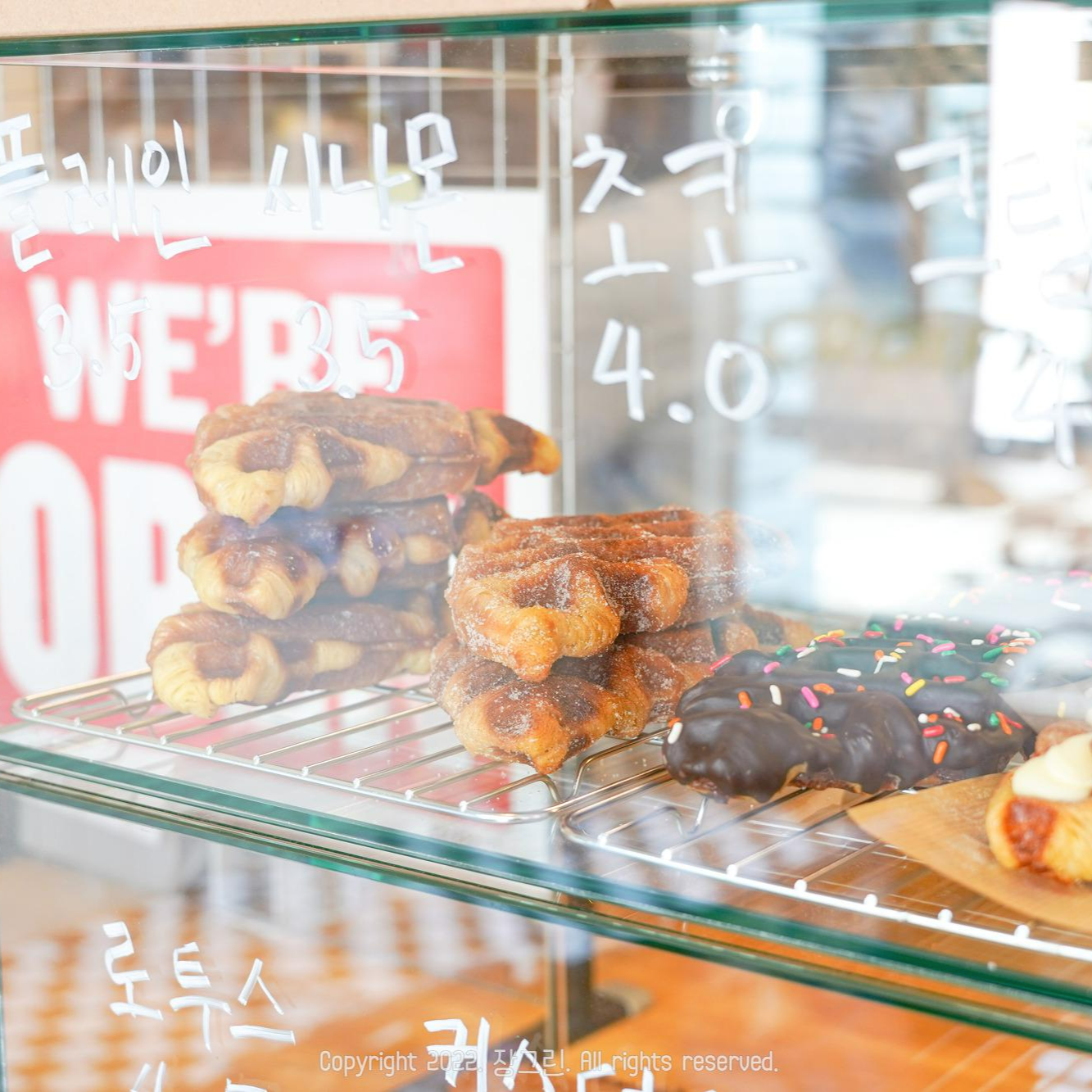 플레인 크로플은 3,500원, 초코 4,000원 크림치즈 4,000원 등 가격은 괜찮았어요. 카야버터, 로투스, 딸기 등 토핑이 다양해질수록 가격도 다양해지는 편이네요. 서면 카페 내 앉을 테이블은 한 5개 정도 있었어요. 두명에서 앉기 좋았고 여럿이서 앉기에는 조금 부족하나 크로플 디저트 가게다보니까 포장도 많고 회전율도 빠른 편인 것 같았습니다.