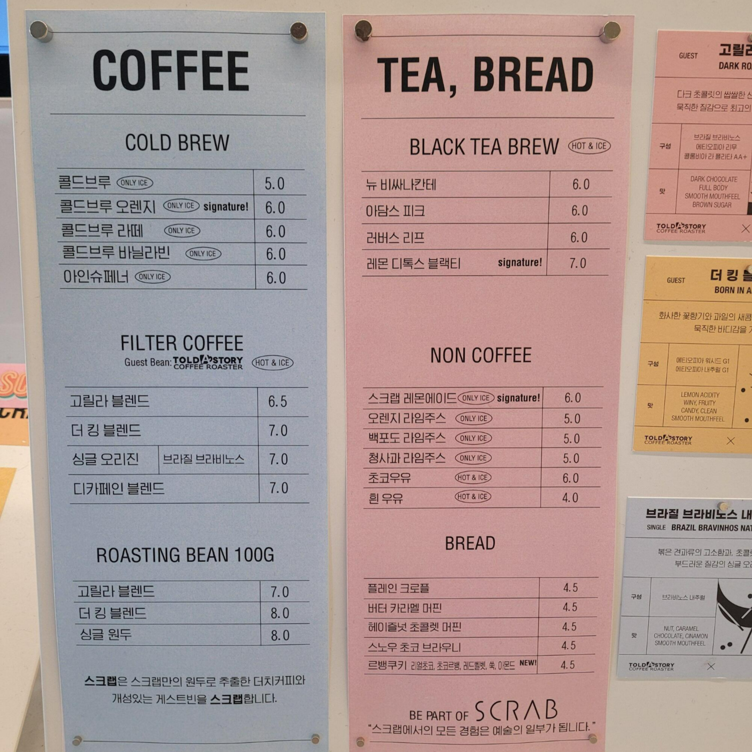 메뉴판 옆에 조그맣게 커피에 대해서 설명 그리고 SCRAB 스케줄도 미리 안내해두셨구요, 4월에는 개인전 그리고 DJ세레머니까지 열린다고 하네요. 오늘의 음악 컨셉은 딥하우스, 하우스, 이런식으로 안내해주신 점은 좋은 것 같아요.