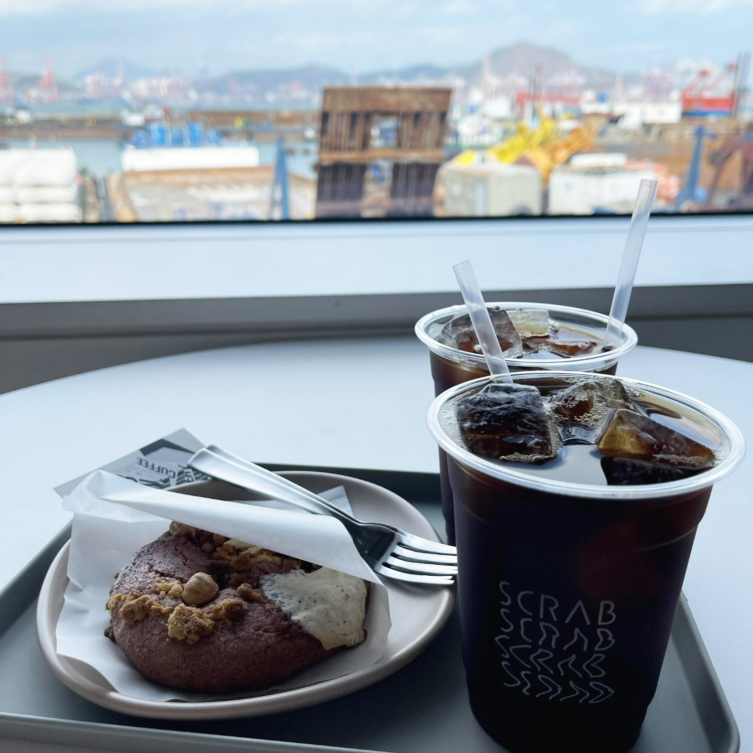 전시도 천천히 보면서, 뷰가 좋은 자리를 잡아서 커피와 쿠키를 받아와 맛있게 즐긴 주말이었어요. 영도카페의 흔한 뷰는 항구뷰에요! 영도 쪽에서만 잘 볼 수 있는 뷰라서 또 특색이 있답니다.