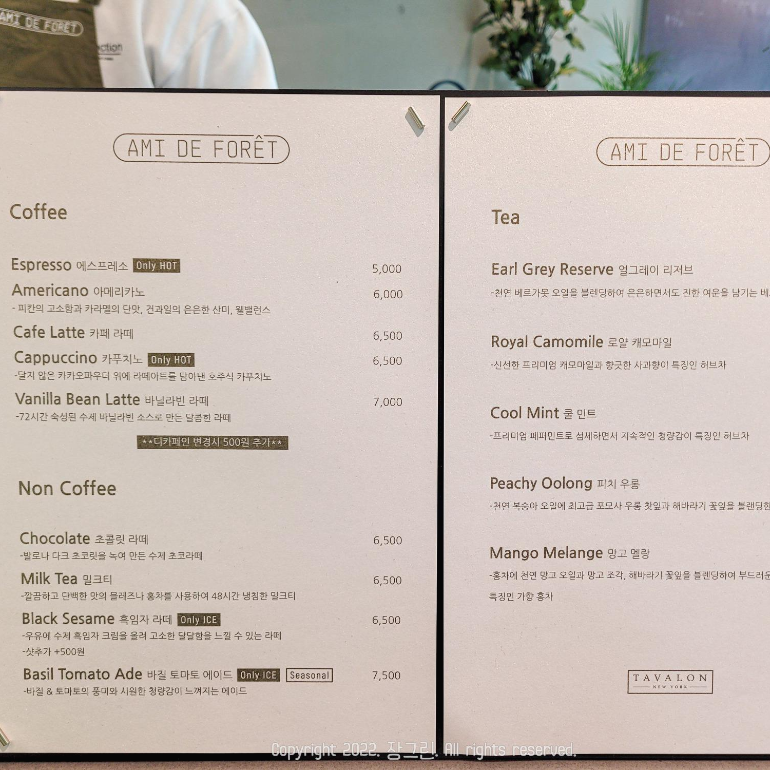 양산카페 아미드포레의 메뉴입니다. 요즘 생기는 카페 답게 가격은 조금 있는 편! 아메리카노는 6,000원 카페라떼 6,500원 바닐라빈라떼는 무려 7,000원 입니다. 초콜릿라떼, 밀크티, 에이드로 논커피 음료도 준비되어 있고 Tea 종류도 있으니 입맛따라 즐기시면 될 것 같습니다.