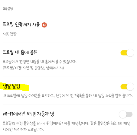 - 아래 생일알림 문구를 활성화 혹은 비활성화 한다.