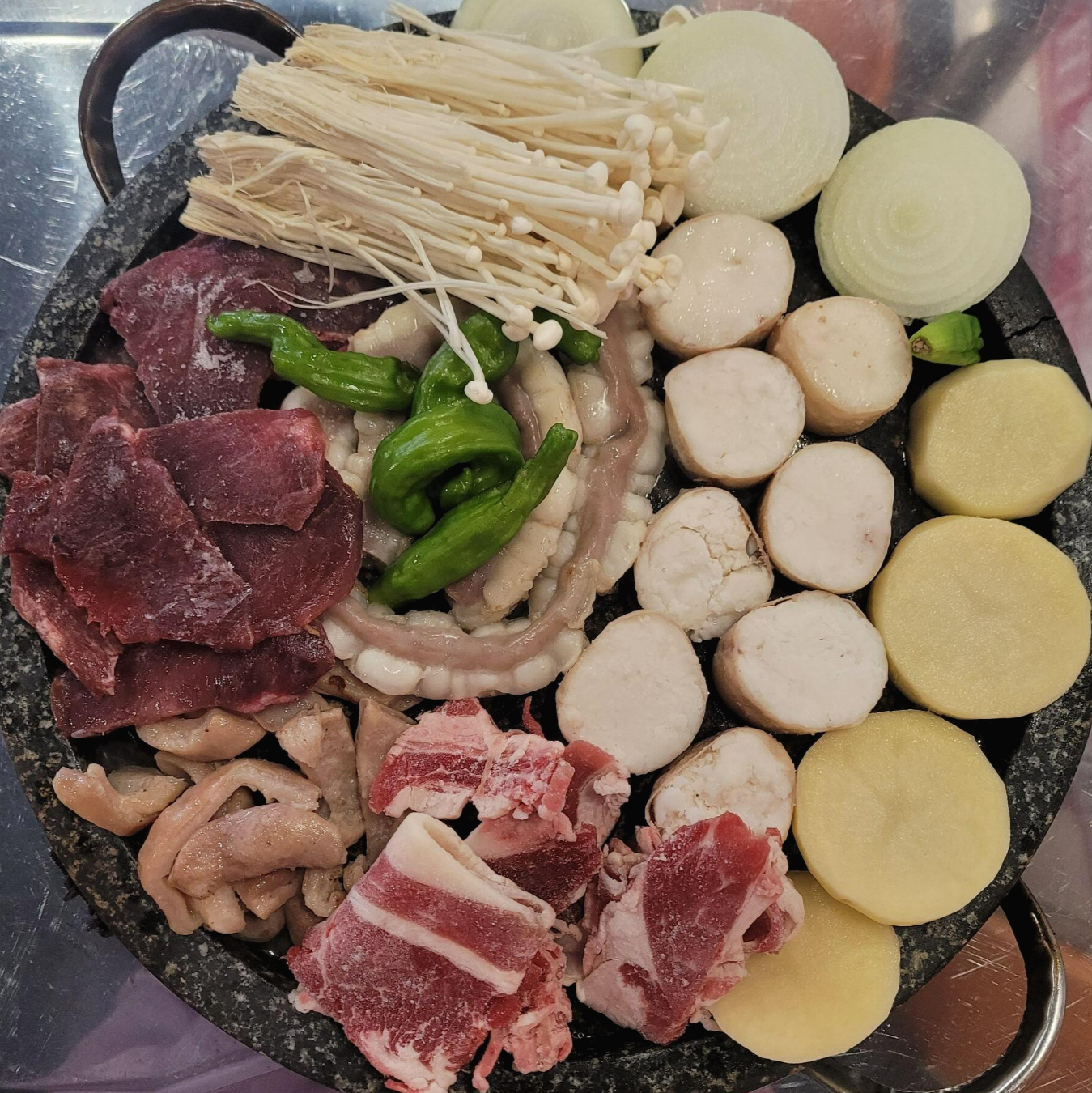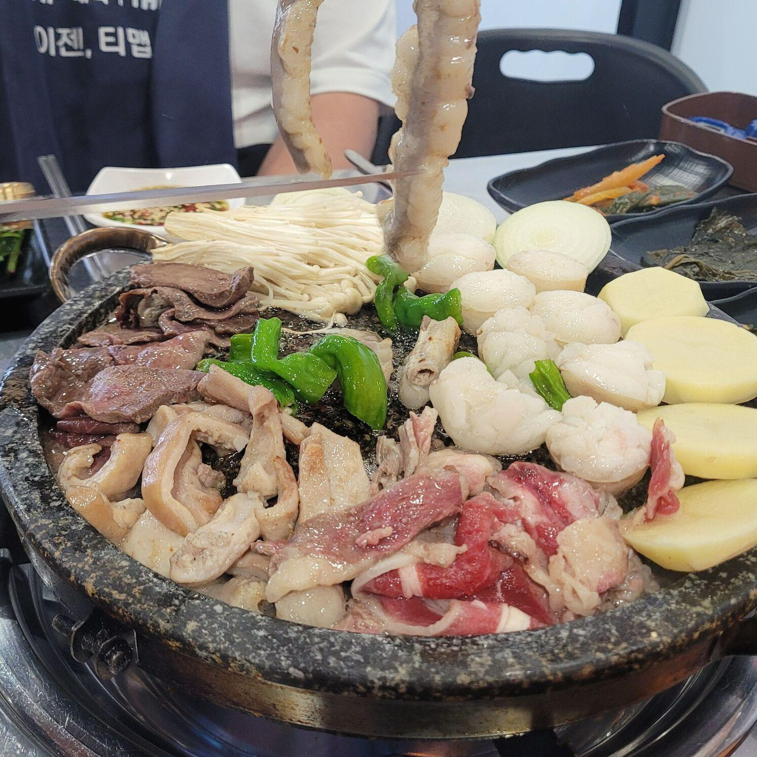 일찍 도착해서 동춘모둠 45,000원짜리 주문했어요. 550g에 곱창+대창+막창+염통이 포함된 메뉴입니다. 동춘돌곱창 좌동점에서는 최상급 한우곱창만을 취급한다고 하십니다. 한 10분정도 기다렸나, 돌곱창 셋팅은 금방 되었어요. 염통과 곱창들이 아주 영롱하게 한 판 가득 채웠네요.
