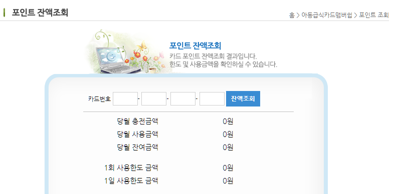 아동급식 전자카드 홈페이지에 방문하셔서 포인트 잔액조회, 포인트 사용내역 조회가 가능합니다.