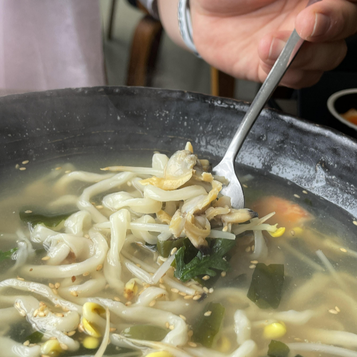 남편이 주문한 바지락칼국수가 나왔는데 바지락이 듬뿍입니다. 재료를 아끼지 않아서 정말 오는 사람마다 해운대 블루라인파크 근처 해운대맛집으로 호평 할만한 것 같습니다. 바지락칼국수는 조금씩 덜어먹었는데도 또 빨간 국물과는 다르게 속이 풀리는 기분이였거든요.