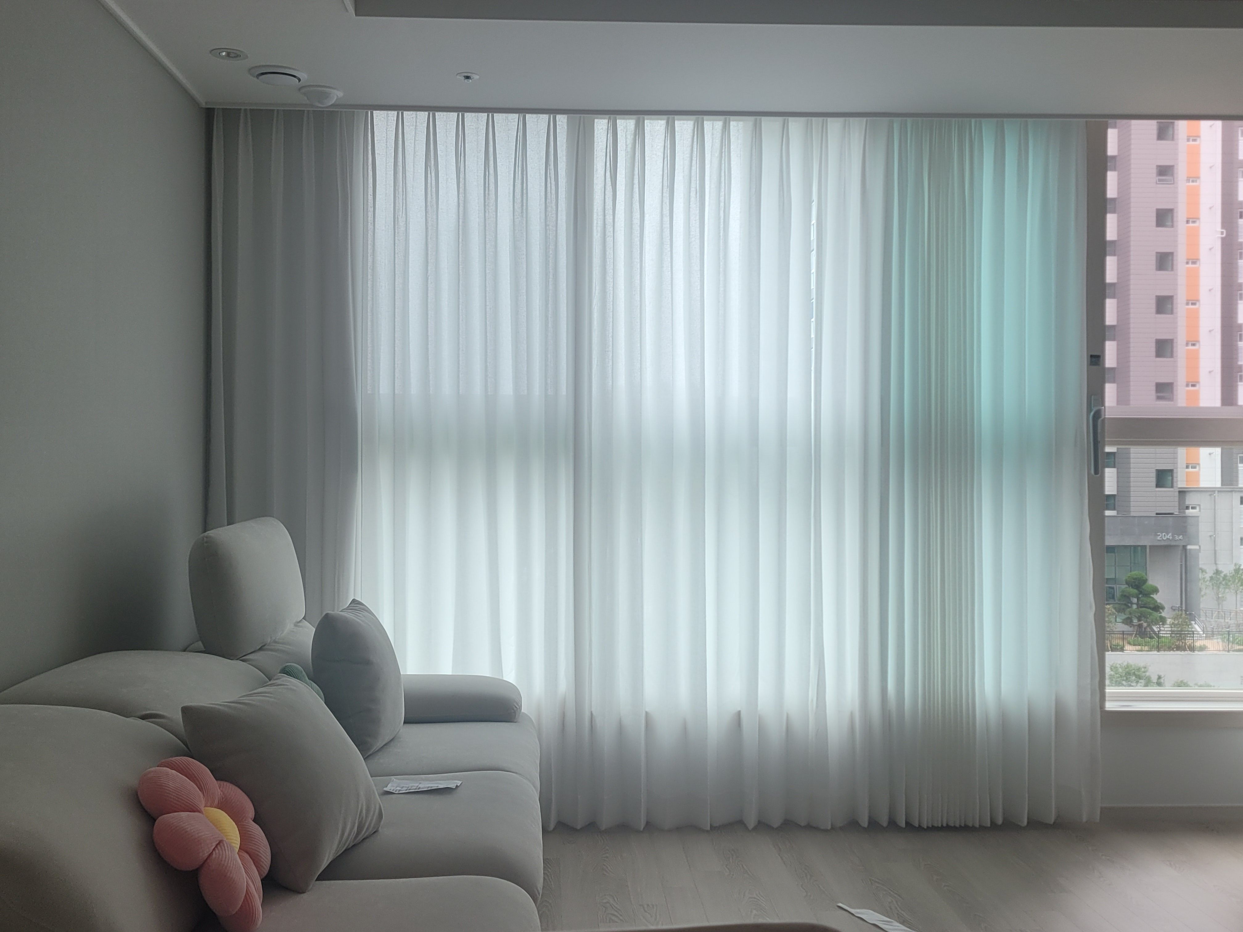 차르르커튼 사생활보호가 안된다는 건 소재따라 다른 것 같아요. 방마다 다양한 소재의 커튼을 도전했는데 거실에는 두툼한 린넨 차르르, 햇빛을 많이 받고 싶은 방은 쉬폰차르르, 때론 암막이 필요한 안방에는 아주 얇은 속커튼 차르르와 형상유지커튼을 추가로 달았답니다.
