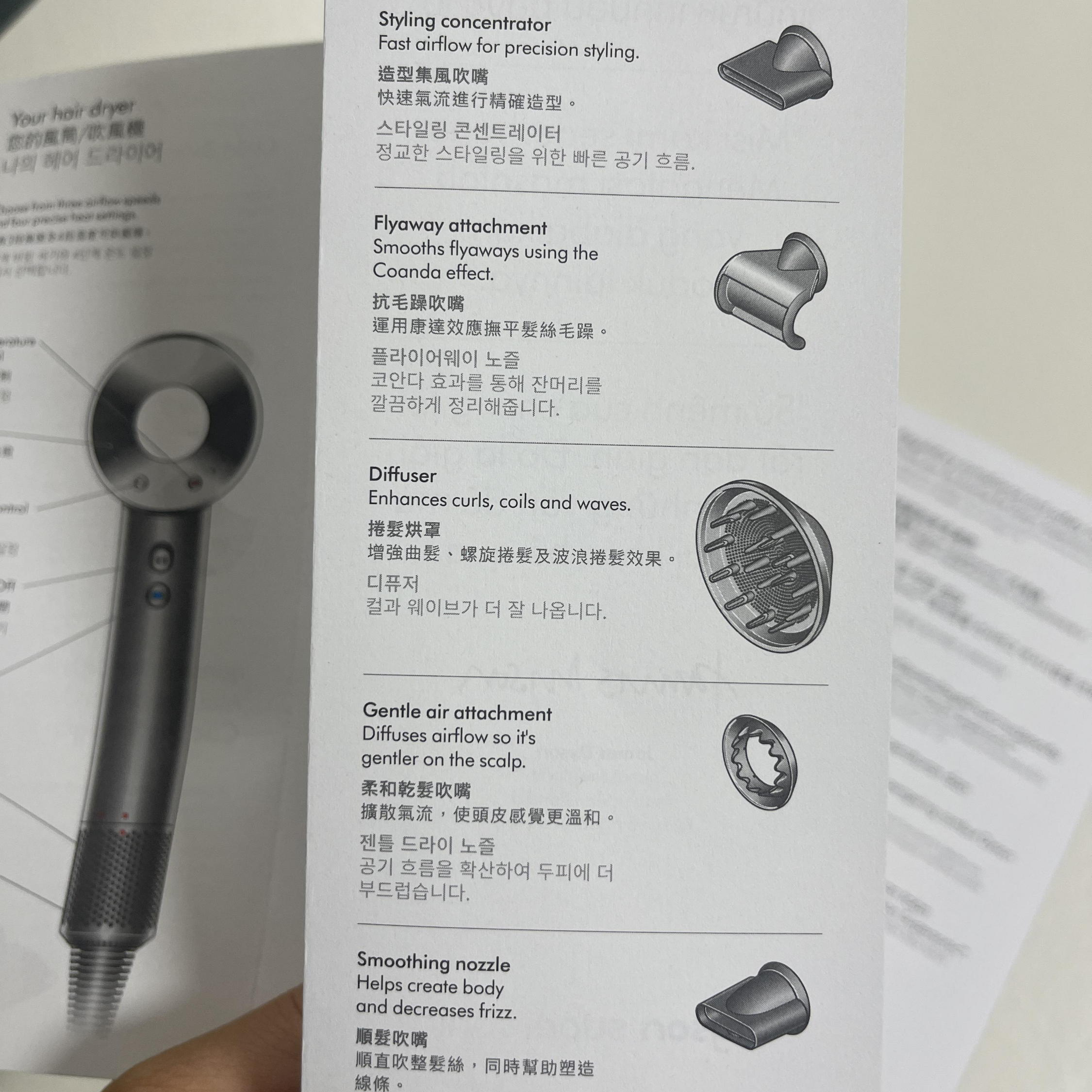 다이슨 모터야 말해뭐해 알아줍니다. 헤어드라이기에 V9 모터가 장착되어 있고 바람은 부드러운 듯 가볍습니다. 1kg가 채 안되는 드라이기의 무게는 전혀 부담이 없어 오래 들고있기도 어렵지 않고요. 저는 중단발 정도에 머리숱이 많은 편인데 머리 90% 정도 말리는데까지 약 5분정도의 시간이 걸렸습니다. 여기에 새로 나온 노즐들을 바꿔 껴 가면서 드라이 스타일링을 해보아도 좋겠죠? 주변 온도에 맞춰 머릿결이 너무 상하지 않도록 온도가 조절된다고 하니 아주 스마트한 드라이기로서 50만원의 값어치를 하는 것 같기도 합니다.