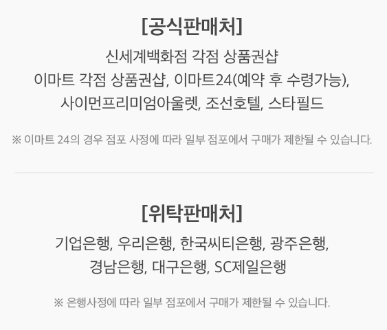 - 호캉스 시즌을 맞이해서 그랜드조선 (부산,제주) 쉐라톤 조선, 웨스틴 조선, JW메리어트 호텔 서울, 파라다이스 호텔, 휘닉스 제주, 해운대 센텀호텔 역시 포함되어 사용이 가능하네요! 여름 휴가를 위한 상품권은 잠시 빼 둘까요?