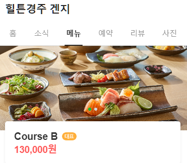 경주에서 조금 더 특별한 디너를 즐기고 싶다면 추천하는 경주힐튼겐지는 호텔 안에 있는 식당가입니다. 1층에 위치하고 있고 예약제로 운영되고 있지만 운이 좋으면 당일 방문해도 홀에서 식사가 가능할 수 있습니다. 정식코스나 코스요리도 준비되어 있는데 A, B 코스로 준비되어 있고 가격은 13만원 ~ 18만원 선입니다. 메뉴를 참고하여 단품으로 취향껏 주문역시 가능합니다. 보기만 해도 군침이 돌고 맛있어 보이네요.