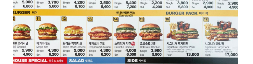 싱글은 저렴한 건 2,900원부터 그리고 세트도 저렴한건 4,900원부터 시작합니다. 데리 마요나 NBB오리지널이 저렴한 편입니다! 가장 비싼 치킨은 미트 마니아로 아무래도 고기가 많이 쌓아져 있기 때문이겠죠. 세트 가격은 7,200원입니다. 시그니처 투게더 팩의 경우 13,000원 시그니처 파티팩은 17,000원입니다. 그럼에도 불구하고 노브랜드의 이미지에 맞게 버거 가격도 저렴한 편에 속한다고 할 수 있겠습니다. 요즘 수제버거는 단품이 1만 원이 훌쩍 넘는 점을 감안한다면요.