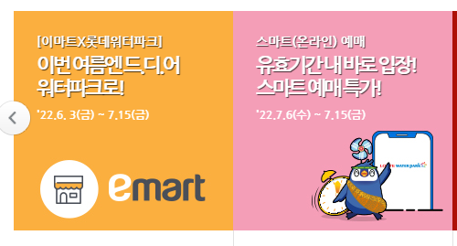 2022년 6월 3일(금) ~ 2022년 7월 15일(금) 까지 이마트 12개 점포 내 영수증 꼬리표 인증 시 동반 1인까지 우대가로 입장이 가능합니다. 본관 종일 대인기준 우대가 29,000원 소인은 24,000원, 본관 오후는 대인 25,500원 소인은 20,000원으로 저렴한 가격입니다! 참여 점포는 이마트 창원점, 마산점,김해점, 양산점,사상점,금정점,문현점,연제점,해운대점,사천점,진주점,통영점으로 12개의 점포이니 해당되는 곳에서 쇼핑하셨다면 롯데워터파크 할인가 꼭 챙겨보시길 바랍니다.