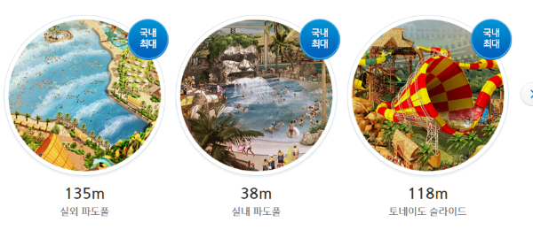 - 국내최대 실외파도풀 (135m), 국내최대 실내파도풀(38m), 국내최대 토네이도 슬라이드 118m