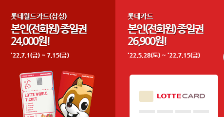 롯데월드카드 삼성카드로 예매를 하면 2022년 7월 15일까지 우대가가 적용됩니다. 성인기준 본인 24,000원 동반 2인까지는 28,000원까지 우대혜택을 주네요. 롯데카드로 결제시에는 성인기준 본인 26,900원 그리고 동반 3인까지 우대가 31,900원에 입장이 가능합니다. 전원실적 조건없이 롯데카드 전 회원이 누릴 수 있는 혜택이지만 실적조건을 채워야하는 삼성카드보다는 혜택이 조금 덜하다는 생각이 드네요.