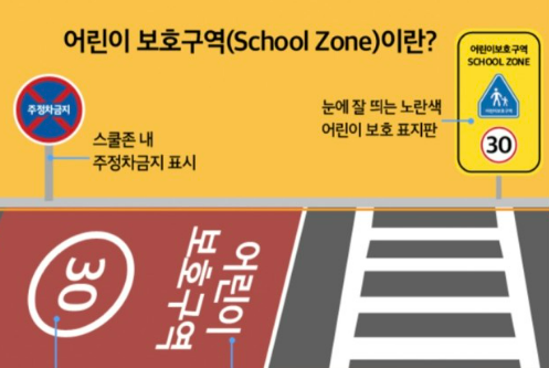 일반 도로보다 처벌, 단속을 강하게 하는 어린이보호구역. 어린아이들의 안전을 위해 꼭 지켜줘야 합니다. 도로교통공단에서 정한 어린이집, 유치원, 초등학교, 학원 등 어린이시설 주변 도로 중 일정구간은 어린이보호구역으로 지정해두었지요. SCHOOL ZONE, 스쿨존 이라는 표지판 많이 보셨을겁니다!