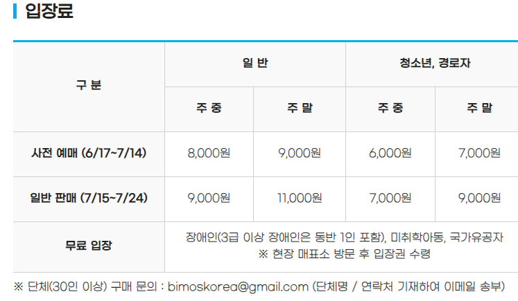 부산국제모터쇼 입장료는 사전예매의 경우 성인 주중 8,000원 주말 9,000원이었습니다. 7월 15일부터 일반판매가 시작되고 나서는 주중 9,000원 주말 11,000원입니다. 청소년의 경우 주중 7,000원 주말 9,000원에 구매가능하며 미취학아동, 국가유공자, 장애인은 무료 입장됩니다. 야놀자, 인터파크, 네이버, 바이모스 각각의 사이트에서 구매가 가능합니다. 저는 집 주변에서 직거래로 주말 6,000원에 초대권을 미리 구매해서 조금이라도 금액을 아꼈네요.
