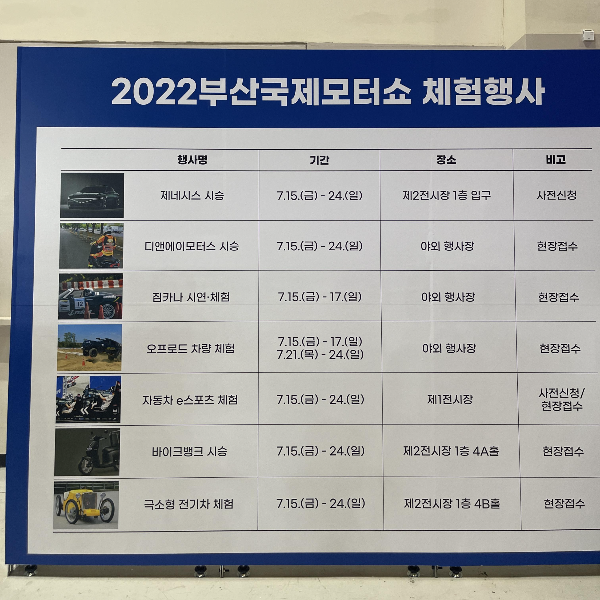 제네시스 시승, 디앤에이모터스 시승, 오프로드 차량 체험, 자동차 e스포츠 체험, 바이크뱅크 시승, 극소형전기차 체험은 7월 15일부터 24일까지의 기간동안 전부 즐겨볼 수 있습니다. 다만 짐카나 시연 및 체험은 7월 17일을 마지막으로 종료가 되네요. 원하는 모터쇼 체험이 있으시다면 장소들 미리 확인하셔서 가 있으시길 추천드립니다! 왜냐면 정말 줄이 길거든요. 저희가 방문한 주말엔 사람들이 너무 많아서 대기할 엄두가 사뭇 나지 않았었는데, 체험 전 미리 알고 가면 원하는 장소에서 대기하면서 시간을 아끼실 수 있을 것 같습니다.
