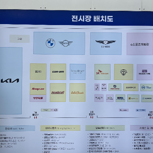 본격 벡스코 행사보러 들어가기 전, 전시장 배치도를 보니 부산국제모터쇼 참가업체들을 한 눈에 살펴볼 수 있었습니다. 현대, 기아의 국내업체 부스가 큰 편이었고 BMW, 제네시스, 롤스로이스, 로드스태프, 라라클래식, 프레임 등이 있었습니다. 아우디, 벤츠, 폭스바겐 등의 부스는 없어서 조금 아쉬웠지만 이색자동차 스냅온, 오프로드모터스, 캔암, 코리아모빌리티,프레임 등이 자리하고 있었습니다.