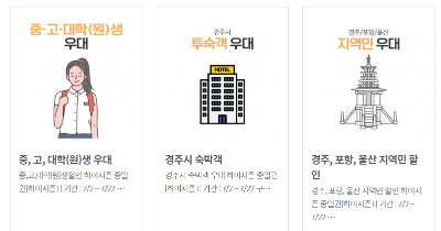 캘리포니아비치 할인은 제휴카드 이외에도 다양한 카테고리의 할인이 있어서 좋은 것 같습니다. 경주여행을 가시는 분들은 1박 2일로 다녀오시는 분들이 많으실 텐데, 경주 주변에 숙박하시면 경주시 숙박객 할인을 꼭 받아보시길 바랄게요.