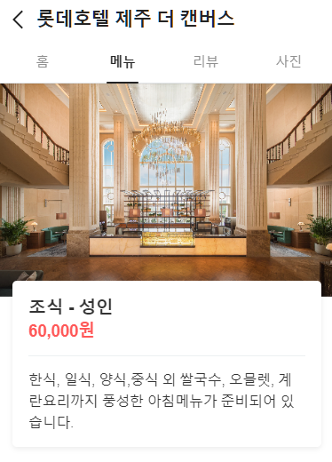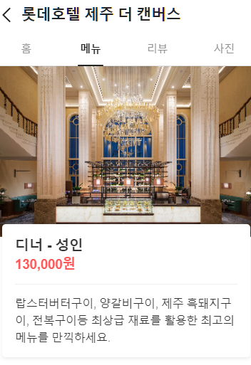 메인빌딩 6층에 위치한 더 캔버스 다이닝 가격은 조식은 성인기준 1인 60,000원입니다. 한식, 일식, 중식 외 다양한 아침메뉴들이 준비되어 있습니다. 직원들 친절한 거야 말할 것도 없고 제주도민들도 제주도 롯데호텔에 머물면서 조식은 꼭 먹고 추천해줄 정도이니까요. 조식뿐만 아니라 제주 롯데호텔 뷔페 더 캔버스의 디너는 13만 원이며 랍스터 버터구이, 양갈비 구이, 흑돼지구이, 전복구이 등 최상의 메뉴를 즐겨볼 수 있습니다.