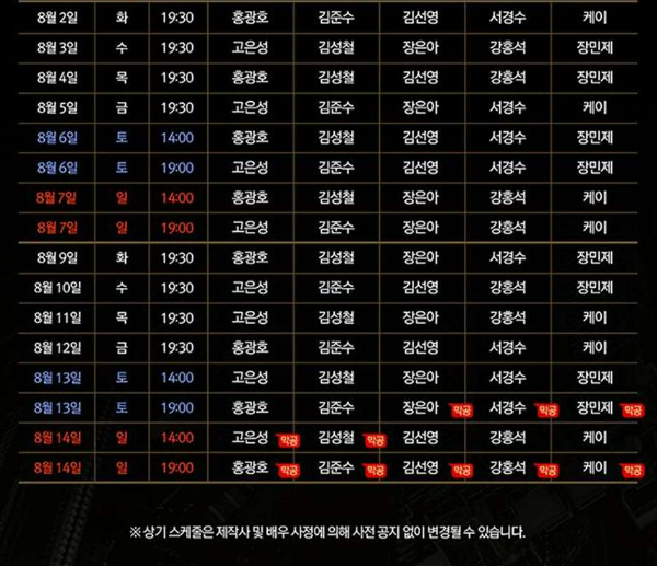 - 8월 3일 수요일 2시 30분, 8월 10일 수요일 2시 30분 공연 없음