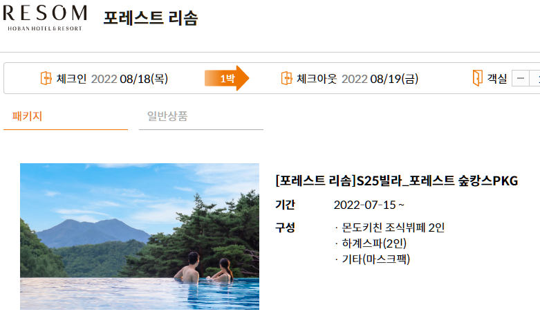예약을 위해 제천 포레스트 리솜의 홈페이지에 들어가보니 자연속에 둘러쌓여서 먹고, 즐기고, 휴식하면서 모든 근심걱정을 날릴 수 있는 숲캉스 패키지가 구성되어 있더라고요. 예약시 100% 생분해 마스크팩 틴즈톤즈까지 증정한다고 합니다. 객실 1박에 몬도키친 조식뷔페2인, 해브나인 웰니스 스파 2인까지 포함되어 202년 8월 27일 성수기까지 즐겨볼 수 있는 패키지이며 웹전용 상품으로 구성되어 있습니다. 제천 리솜포레스트 예약을 고려한다면 준비된 패키지도 훌륭할 것 같습니다.