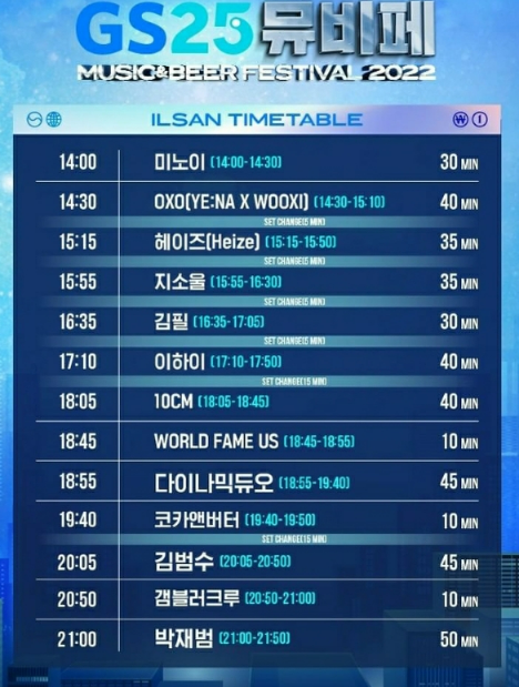 특히 뮤비페일산에서는 미 노이, OXO, 헤이즈, 지소울, 김필, 이하이, 10cm, 다듀, 코카 앤 버터 , 김범수, 갬블러크루, 박재범까지 2시부터 9시까지 연예인들의 공연이 쉬지 않고 이루어집니다.