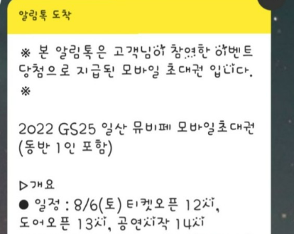 7월 8일 카카오 알림톡으로 개별 발표가 되었다니 이미 GS뮤비페 일산, 부산에 가실 분들은 정해져 있다고 보시면 되겠네요!