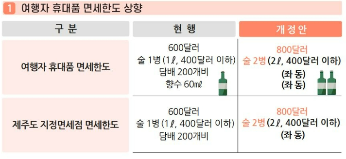 - 2023년 세제혜택 중 여행자 휴대품 면세한도는 현행 600달러, 술1병, 담배 200개비, 향수 60ml 입니다. 다만 개정되는 안은 면세한도 800달러로 늘어나며 술 2병 (2L, 400달러 이하), 담배 200개비, 향수 60ml 입니다. 제주도 면세한도 역시 600달러에서 800달러로 면세점 한도 상향되며 술 2병, 400달러 이하까지 가능합니다.