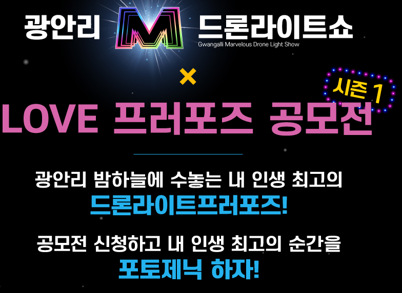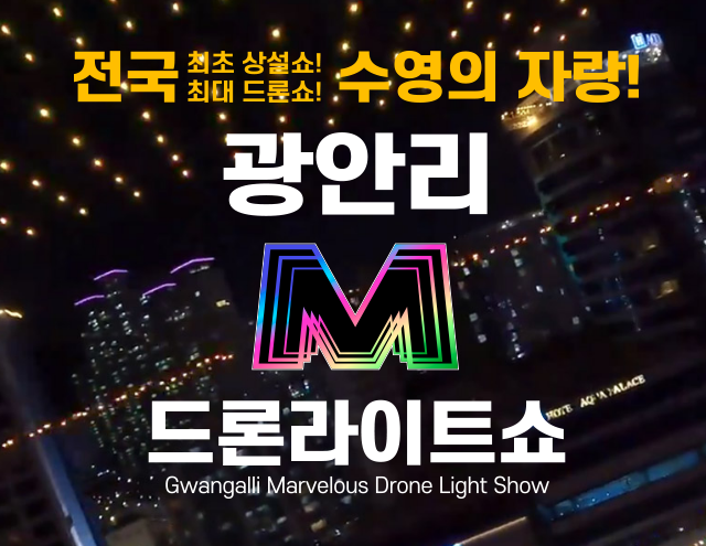 Marvelous를 의미하는 놀라운, 경이로운 뜻의 M은 드론이 뿜는 불빛과 광안대교의 야경이 어우러져서 경이로움, 신비로움을 선사하겠다 라는 의미를 가지고 있는데요. 기상상황에 따라 공연이 일정 변경될 수 있고 우천 시에는 하지 않는 날들도 있었으니 참고해보시면 좋을 것 같습니다. 그리고 드론 프러포즈 등 다양한 시민참여 프로젝트까지 기획 중이라고 하니 더욱 기대가 됩니다.