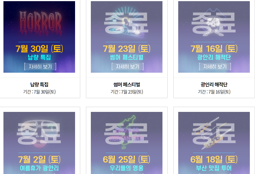 매주 매주 다채로운 테마들로 광안리해수욕장 드론 쇼는 빛납니다. 부산 맛집 투어, 우리들의 영웅, 여름휴가 광안리, 광안리 해적단, 서머 페스티벌 등 신선하지만 부산 관광객들의 발길을 사로잡을 주제들로 풍성합니다. 7월 30일 토요일에는 납량특집이 준비되어 있습니다. 현실 속 귀엽고 무서운 호러 캐릭터를 볼 수 있다고 하니 이번에도 아이들과 어른들에게 인기가 많은 쇼가 될 듯합니다.
