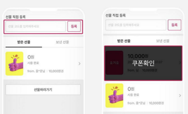 - 선물함에서 등록된 쿠폰을 확인합니다. (쿠폰함이 아님 주의)