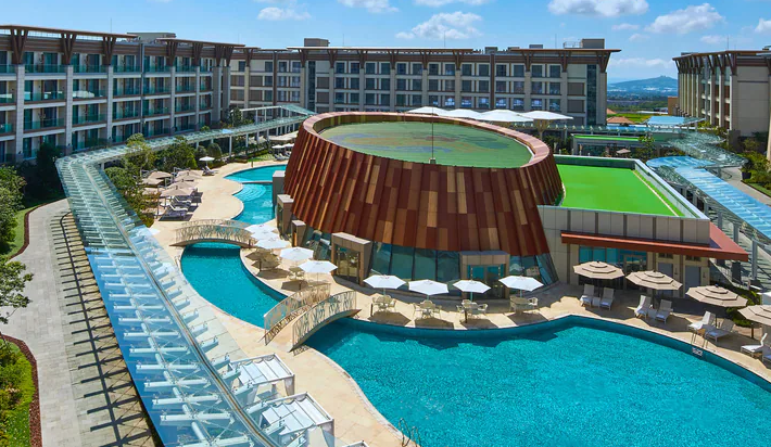 제주 5성급 호텔이라서 무엇보다 깔끔하고 모던함이 가득합니다. 룸에서 편안히 휴식을 취하다가 1층의 복도를 따라가면 보이는 모실수영장에서 수심이 낮은 곳에서는 아이와 놀기 딱 좋습니다. 야외쪽에서는 신화월드 리조트를 배경으로 한 에메랄드 빛 수영장이 무척 멋지답니다.