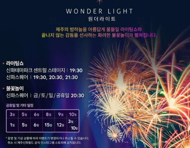 저녁에는 맥주한잔 할 수 있는 신화월드 테마파크 쪽까지 마실삼아 걸어 나가서 진행하는 라이트쇼를 보면 무척 낭만적이지 않을까요? 제주 밤하늘을 아름답게 물들이고, 화려한 불꽃놀이까지 준비되어 있어서 신화스퀘어에서 금, 토, 일, 공휴일 8시 30분에 진행하는 불꽃놀이를 봐도 좋을 것 같습니다.