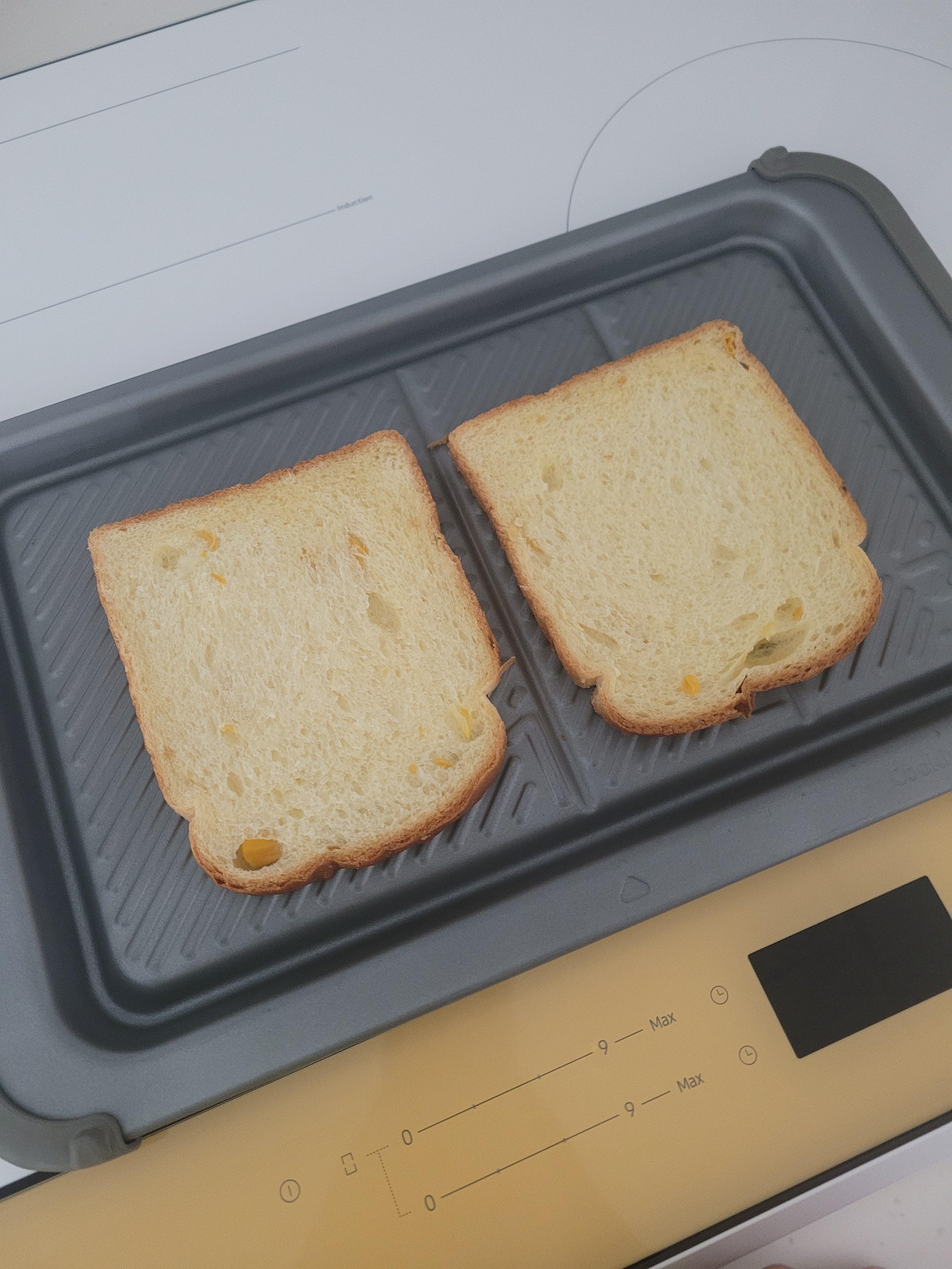 비스포크 큐커 해동기능을 이용해서 꽁꽁 얼려둔 냉동 옥수수식빵을 꺼내고 4분간 돌렸더니 따뜻하게 식빵 해동이 잘 되었더라고요.
