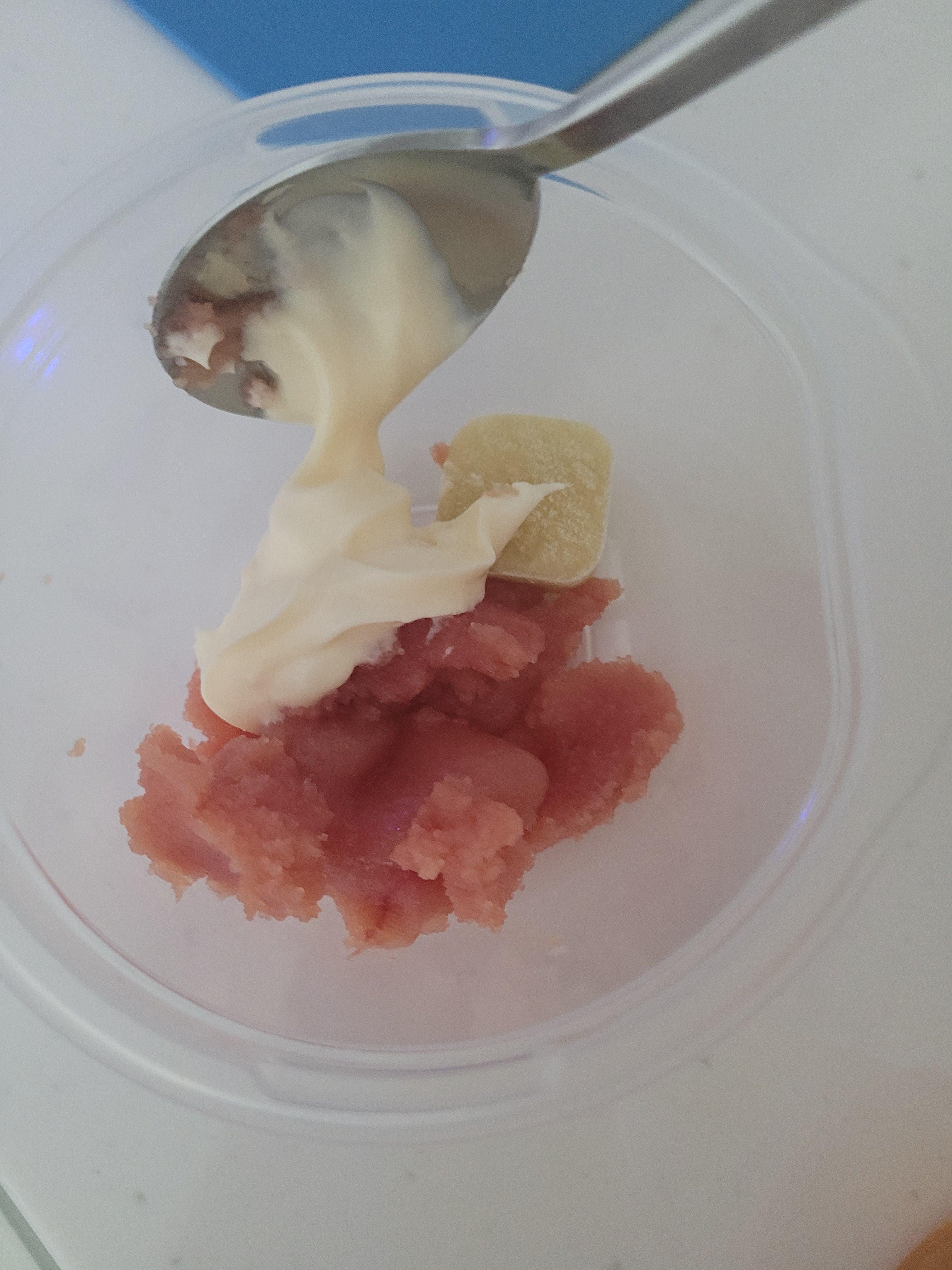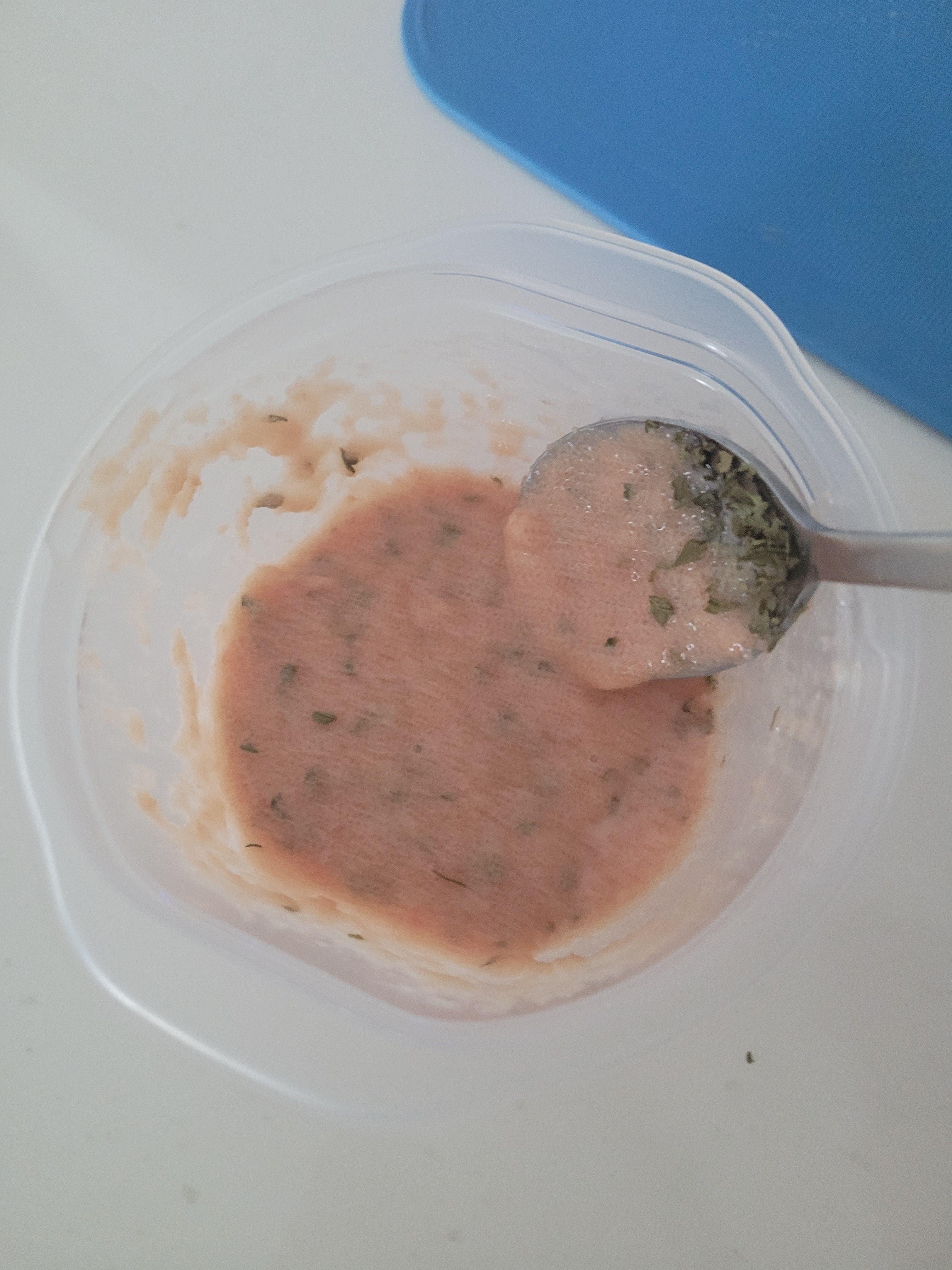 그리고 냉동해둔 다진마늘 한 조각, 마요네즈 숟가락으로 한 스푼, 올리고당 한 스푼을 넣고 집에있는 파슬리까지 넣고 잘 저어줬습니다.