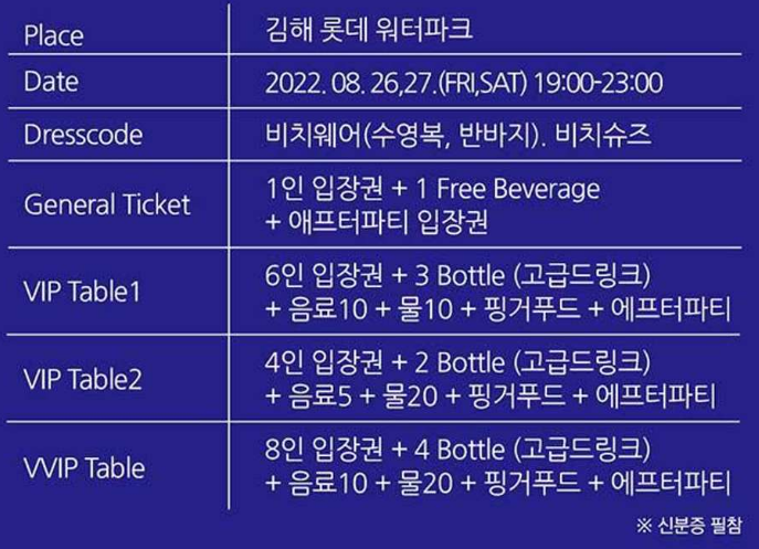 2022년 8월 26일 금요일부터 8월 27일 토요일까지 이틀 간, 오후 7시부터 11시까지 롯데워터파크 풀파티가 펼쳐집니다. 티켓팅이 미리 필요한데요, 1인당 77,000원의 가격으로 인터파크 및 티켓링크에서 미리 예매를 해야 합니다. 지정석이 따로 정해진 공연이 아니고 1인당 4매만 구매가 가능하기 때문에 풀파티가 열리는 김해롯데웥파크 야외파도풀장은 그 날에는 무척이나 북적일것으로 예상됩니다. 만 19세 이상의 성인만 공연을 관람할 수 있으며 관람자 모두 공연 당일에 신분증을 지참해야 함을 유의하세요. 드레스코드는 아주 핫하게도 수영복, 비키니입니다!