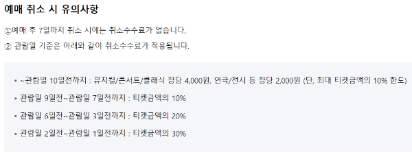 추가오픈 전까지는 예매캘린더에 날짜가 표시되지 않고 있으니 홈페이지에서 취소표 날짜가 열리면 예매해야 합니다. 예매 후 7일까지 취소시에는 수수료가 없으나 부득이한 사정으로 예매취소 시 규정을 택하고 있으니 참고하시면 좋겠습니다.