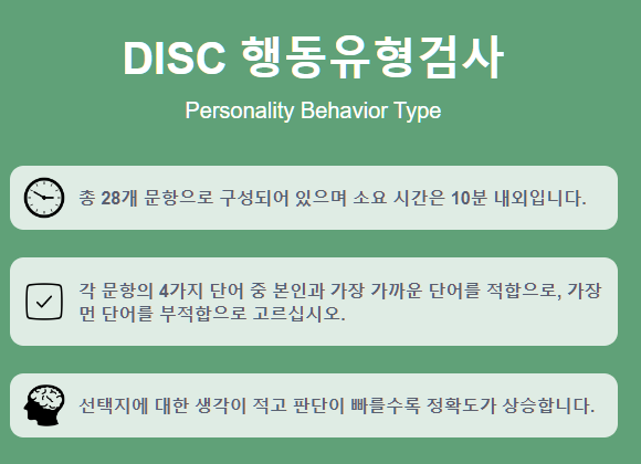 짧게 10분정도로 28개 문항에 본인과 가장 가까운 단어를 선택하고, 먼 단어를 부적합으로 고르면서 저도 스스로 나를 이렇게 생각하는구나를 한번 더 느껴보았던 것 같습니다. 판단을 빠르게, 생각도 빠르게 하면서 별 생각없이 한번 체크해보시면 좋을 것 같습니다. DISC 행동검사링크 같이 공유해볼테니 진행한번 해보시고 어떤거 나왔는지 재미로 서로 지인들과 공유해보면 좋을 것 같습니다!