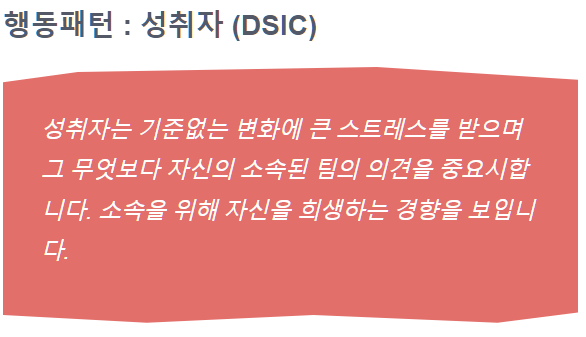 주도적으로 듣고 말하며 성취 욕구를 통해서 성장하는 사람이라고 합니다. 어느정도 맞는말인 것 같아요. 도전하는 것을 좋아하고 도전하며 권위와 권력을 쟁취하는 사람이라고 하는데요. 삶의 페이스가 빠르며, 의사소통 과정에서 간단하고 명료하게 말하는 특성이 있다고 합니다. 일을 할 때 "나는 뭐할까?" 같은 말을 외우며 내가 할 일을 찾아 나서는 편이라는 것을 저도 느끼고 있는데 꼭 찝어서 설명을 해주더라고요.