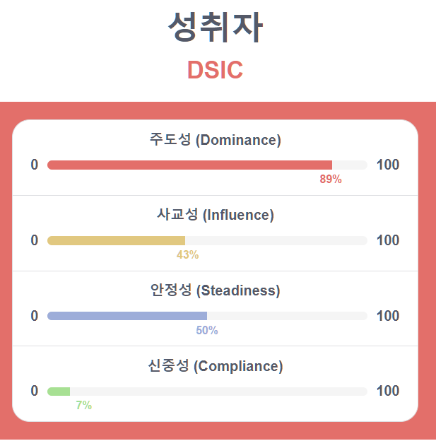요즘 행동유형검사가 뜨고 있더라고요. 약 10분정도면 할 수 있는 간략한 DISC행동유형검사 저는 해보니 성취자가 나왔습니다. 주도성이 89%, 사교성 43%, 안정성 50%, 신중성 7%로 신중하지 못한 사람으로 저를 평가했나봐요. 여러분들은 행동유형검사 DISC에 따른 어떤 유형이 나왔는지 궁금하네요. 저의 행동 강점은 주도성인가봐요.