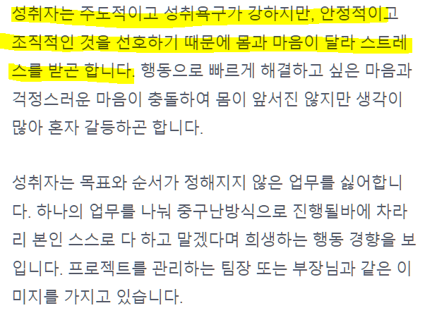 업무과정보다 결과를 지향, 빠른 결과를 보기위해 속도를 낸다는 것도 공감했습니다. 보상을 중요시해서 워라밸보다 연봉 그 자체에 집중한다는 점도 사회생활을 하면서 저도 인정하는 부분이기도 했고요. 기준없는 변화에 큰 스트레스를 받고 소속을 위해 자신을 희생하는 경향을 보인다는 점에서도 어느정도 공감하는 것 같아요.