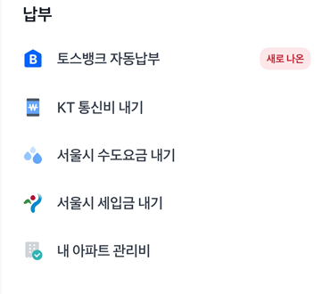 부산에는 해당사항이 없었지만 서울시 수도요금, 서울시 세입금, KT통신비내기 모두 가능하더라고요. UI도 간편하고 심플해서 요즘 가장 많이 사용하는 토스뱅크로 아파트관리비 즉시 할인받고 혜택을 누리면 좋을 것 같습니다.