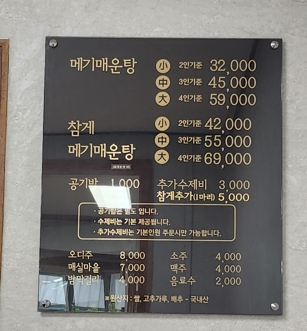 비오는날 음식 매운탕을 먹기로 정했다면 식당 가격 참고해주세요. 2인기준 소짜로 32,000원 3인기준 45,000원 4인기준 59,000원으로 메기매운탕 전골에 나옵니다. 그리고 참게가 들어간 참게매기매운탕도 기장 무룡매운탕 집에서는 별미랍니다. 공기밥은 1,000원으로 따로 주문해야하고 추가 수제비는 일단 한번 드셔보고 추가하는 것이 좋겠습니다. 그냥 수제비 양도 많더라고요.