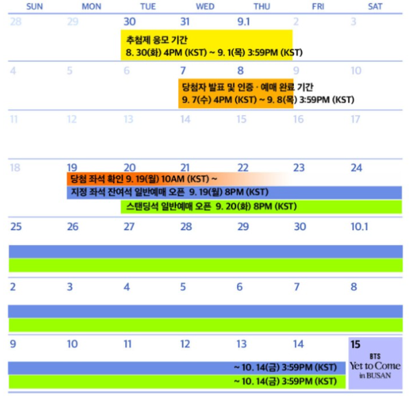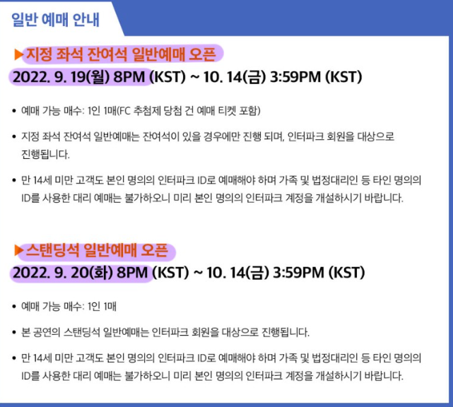 - 스탠딩석 : 9월 20일 오후 8시부터 10월 14일 오후 4시까지