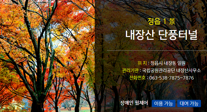 정읍시 내장동 일원에 위치한 내장산 단풍터널은 한국관광 100선에 선정된 곳이기도 합니다. 조선8경의 하나로 호남의 금강산이라 불렸던 내장산은 여름엔 녹음, 가을엔 만산홍엽, 겨울엔 설경으로 유명해 사계절이 아름다운 가을여행지 입니다. 특히 내장산 단풍터널은 108주의 단풍나무가 있고, 정읍내장산단풍나무는 천연기념물로 지정이 되어있다고 하네요.