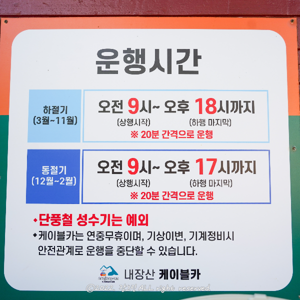 - 내장산케이블카는 연중무휴이며 기상이변, 기계정비시 운행을 중단할 수 있음