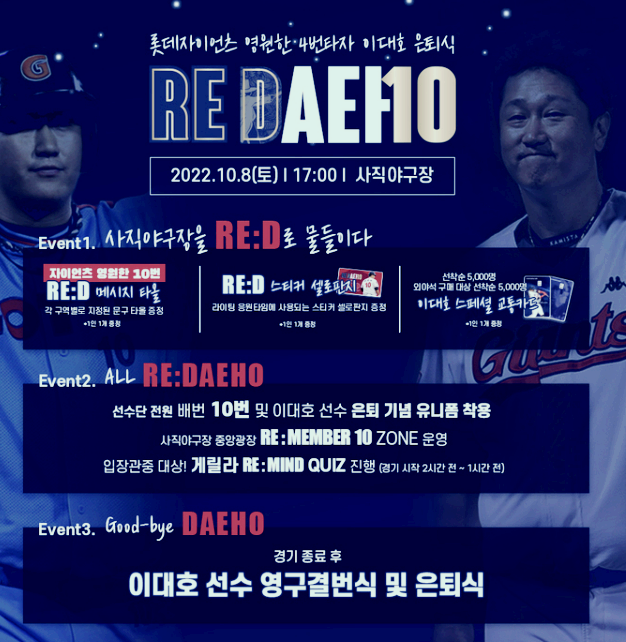 롯데 자이언츠에서는 22년 10월 8일 이대호은퇴식 RE:DAEHO를 개최합니다. 롯데이대호선수의 선수생활을 되돌아보며, 은퇴 이후의 새 시작을 응원하는 의미를 담아 이번 행사를 진행한다고 하는데요.